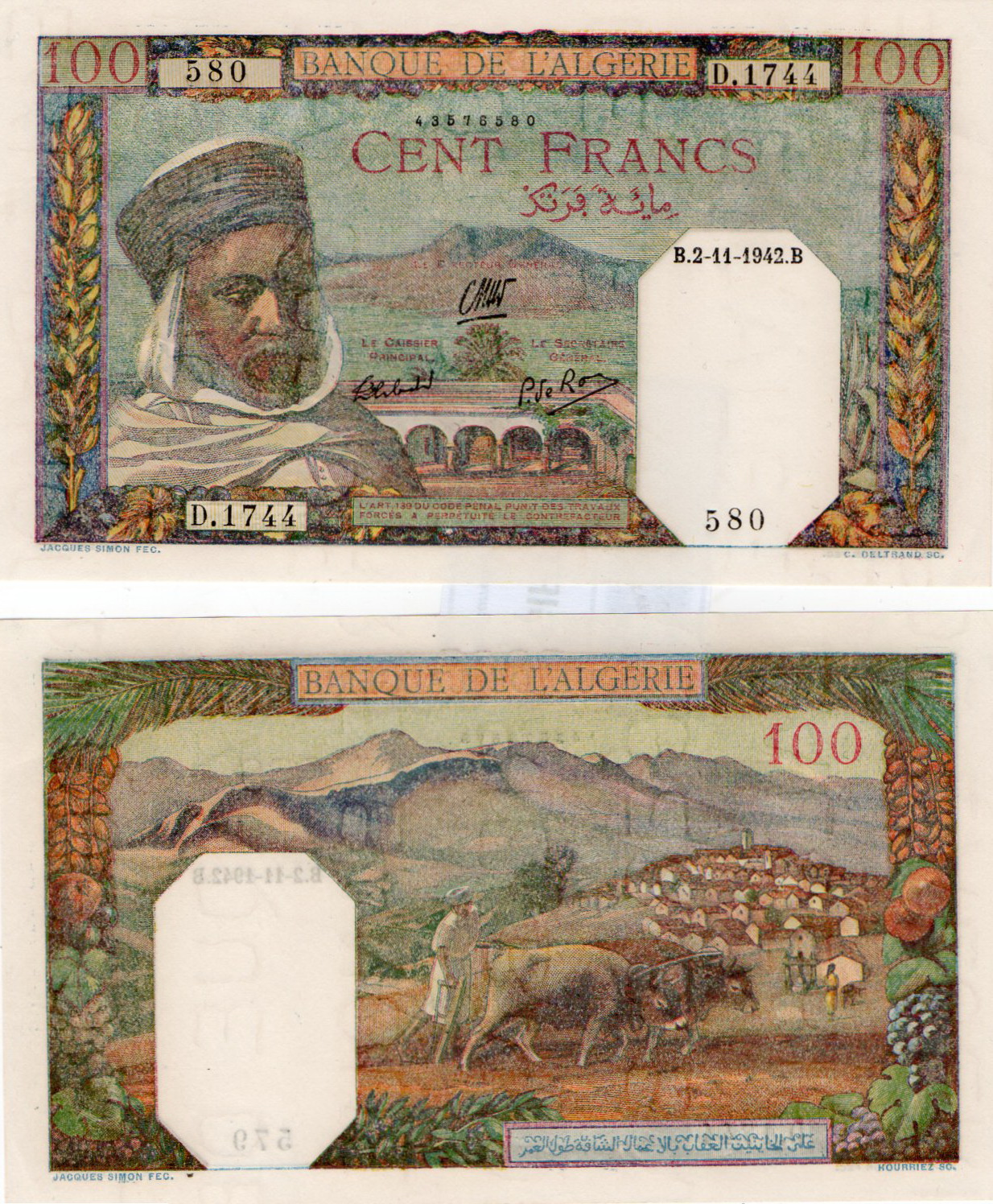for similar notes with watermark WOMAN'S HEAD and dates from 03.07.1939 - 05.03.1942 see ALGERIA P-85